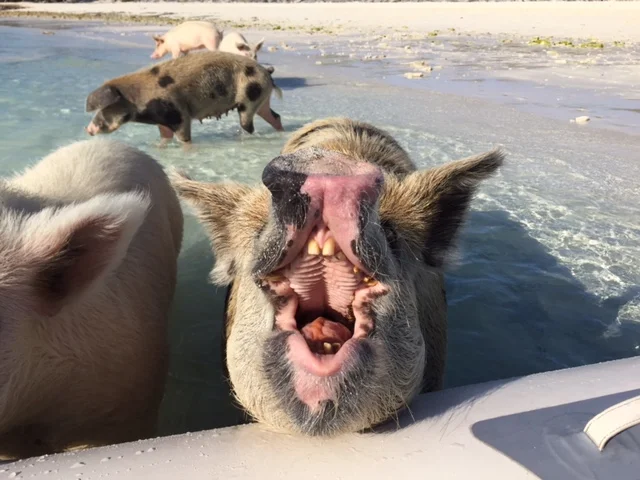 We are headed to Big Majors Spot. I do not know why it is called Spot and not Cay. I will research it. We will be just north of the town of Staniel. Staniel has a marina, grocery store, shops, bars and restaurants.. Perhaps after a night or two on the hook we will be ready for some recreation. Big Majors Spot is home to the world famous spotted swimming pigs. They will come right to you and expect to be fed. We have been told they favor carrots. Be careful when you feed them or they might bite your finger off thinking it is a nice juicy carrot.