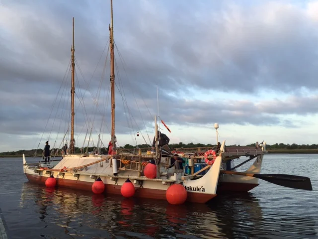 Hawaiian double hulled sailing canoe arriving in Honolulu from Tahiti