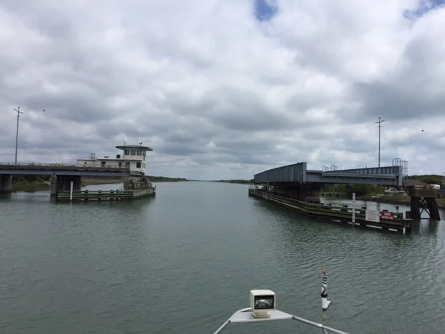 We arrived 15 minutes early for the bridge opening and had to wait in the channel with two other boats. We “touched bottom” for the second time. Just soft mud but a touch. We were in the channel waiting for the Surf City swing bridge to open. Dale was taking over the helm after we passed the bridge. He changed the GPS to plot the location of the next bridge. Since we were stopped in the middle of the channel I did not immediately switch the GPS back to our location. There was a slight current that pushed us to the side near the green channel marker at 0.0 mph. It looked fine until I felt that little something different. I moved us off the mud. In checking the GPS, if I had put it back on our location I would have seen where the deeper water was. It was my fault. No overheating and no vibrations. I will check the raw water strainers tonight.