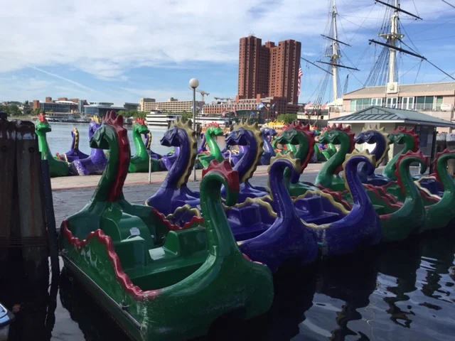 Much of Saturday afternoon was spent exploring the Baltimore inner harbor by dingy. There are numerous large commercial docks that have been converted from unloading ships to retail glut. The docks have large cleats for freighters but the dock space has been converted to bars, restaurants and museums.