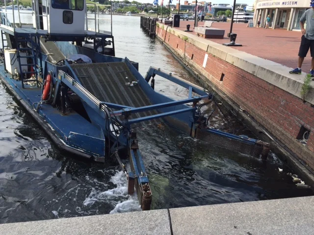 There is a trash collection boat that picks all the trash in the inner harbor each morning. It works quite well.