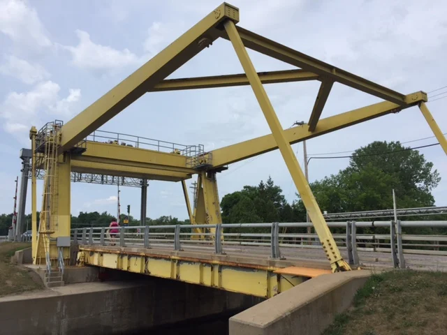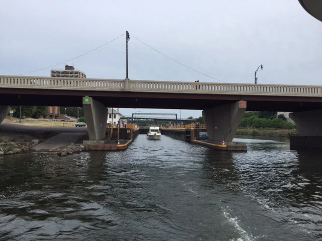 We were trapped like rats at the entrance to lock one on the Oswego Canal in Phoenix, NY. The lock is working but the bridge on the north side of the lock will not open. Priscilla and I walked over to talk with the lock master. There was another fellow flipping pages on a giant paper schematic of the bridge’s electrical system. The power supply to lower the guard gates is not working. The bridge cannot be raised until the guard gates are down. The electrician said it could take 30 minutes or 3 hours to determine the cause of the problem. We wished him good luck. The bridge height is only 11 feet. We need 18′ of clearance.
