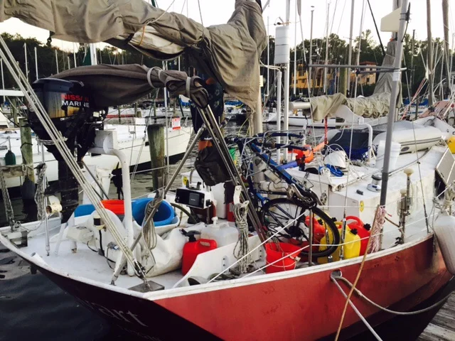 We met Randy Ferrand at the docktail area. His house burned down in a major forest fire near Pikes Peak. He didn’t have house insurance because the house was paid for. “Why would you insure a house that doesn’t have a mortgage?” He decided to buy a sailboat instead of a house and has been a live aboard at ESM for a year. His plan is to sail his 40 steel ketch to Guatemala and build a rental storage facility. His lease expires at ESM on November 10. He has minimal sailing experience. His claim to fame is bicycle riding. He alleges to have ridden his bicycle around North America including Alaska, South America, Scotland, Australia and the mountains of Nepal. Each of these events took at least a year to complete. He would work for a while to save money and then just take off on a bike trip. Randy will leave all of his memorabilia from his bike rides in his car. That way if he does not survive his single handed gulf crossing his legacy will live on.