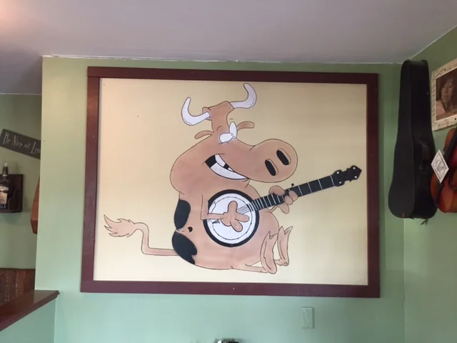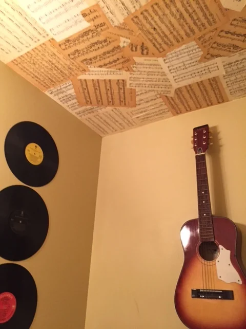 A photo by Andy in the ladies bathroom. Guitars but no banjos and sheet music for wallpaper.