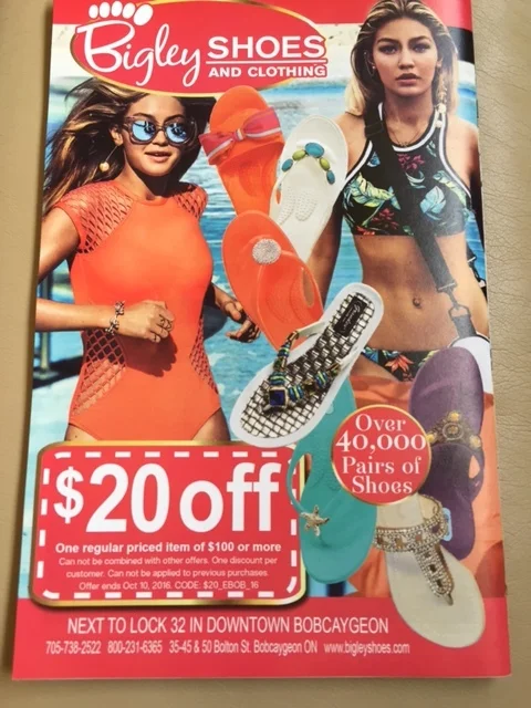 Bonus photo – this is the first time there has been an inaccuracy in the CL blog. It turns out when we asked the locals in Peterborough where we could find a shoe store with 30,000 pairs of shoes we were met with blank stares. After further investigation we discovered the famous shoe is not in Peterborough but is in Bobcaygeon. If you look closely at their advertisement you will see that it is worth the wait. Bigley’s shoe store now has 40,000 pairs of shoes and 25,000 bathing suits. We will be in Bobcaygeon on August 11 and will provide a full report.